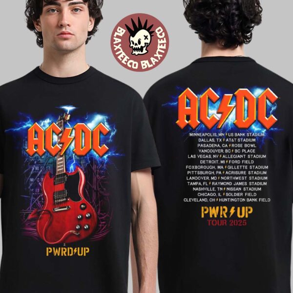 Blaxteeco: About ACDC Angus Gibson Electric Guitar PWR UP North America Tour 2025 Two Sides Unisex T-Shirt: