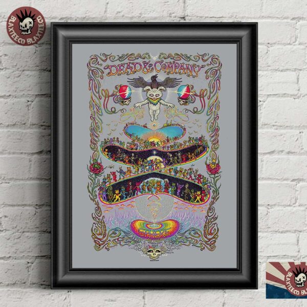 With intricate details and psychedelic charm, this artwork beautifully captures the spirit of Dead & Company—a fusion of life, music, and cosmic wonder. The skeletons dance in joyful motion, symbolizing the band’s enduring legacy, while the bear and raven add depth to the artwork’s storytelling, reflecting themes of wisdom, transformation, and connection to the unknown. The vivid color palette and whimsical elements transport you straight into the heart of the Las Vegas Sphere experience, making this a must-have for any devoted Deadhead.