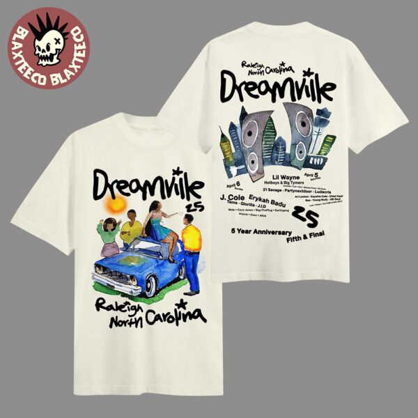 The front design features a hand-drawn street-style illustration of people vibing around a classic blue car, symbolizing the soulful, nostalgic energy of Dreamville. The bold “Dreamville 25” lettering and Raleigh North Carolina script give the tee an authentic, hometown feel.