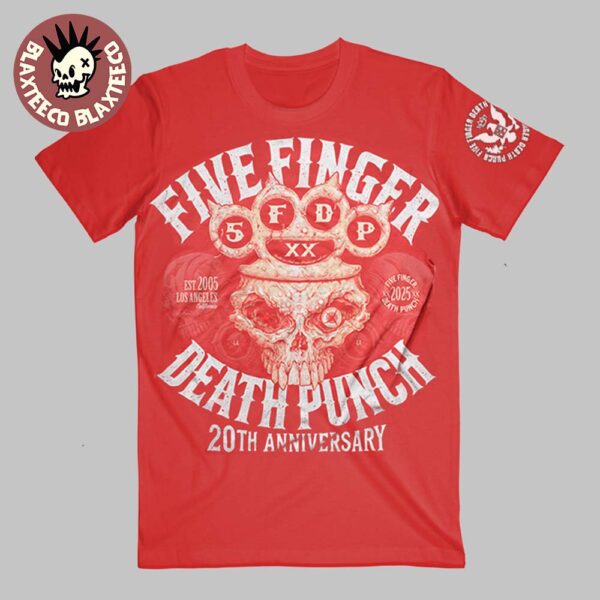 Five Finger Death Punch 20th Anniversary 2005–2025 Knucklehead Red T-Shirt Features: