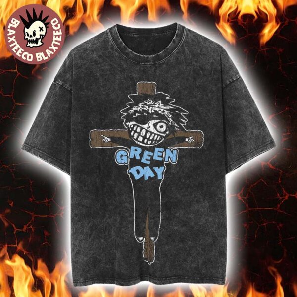 Crafted from premium cotton and finished with a bold vintage wash, this charcoal-black tee sets the tone for raw expression. The front design features a twisted crucifixion cartoon character — the “One-Eyed Bastard” — with a wild-eyed grin, outstretched arms, and jagged hair. The hand-drawn “GREEN DAY” text in electric blue cuts through the darkness with that signature anarchic energy. Set against cracked textures and infernal fire tones, this shirt looks straight out of a scorched zine or grungy back alley gig poster.
