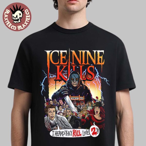 Unleash your inner horror-metal fan with the Ice Nine Kills “I Heard They Kill Live 2” Comic Style Crowd Killer Essentials T-Shirt. This striking tee is a must-have for fans of the theatrical metalcore band known for blending spine-chilling storytelling with explosive live performances. Featuring bold, comic book-inspired artwork, the design showcases a masked figure wielding a blade in front of a terrified crowd—perfectly capturing the band’s signature horror aesthetic and intense stage presence.