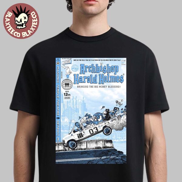 Celebrate an unforgettable night of raw rock energy and spiritual flair with the Jack White Masonic Temple Detroit Michigan 2025 Night 1 Show Poster On April 12th 2025 Archbishop Harold Holmes Bring The Big Money Blessing Unisex T-Shirt. This exclusive concert tee commemorates Jack White’s electrifying performance at the legendary Masonic Temple in Detroit, Michigan — Night 1 of his 2025 tour — blending the power of music with the unique charm of Archbishop Harold Holmes’ “Bring The Big Money Blessing” vibe.