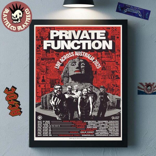 Celebrate the chaos, energy, and unfiltered punk spirit of one of Australia’s most electrifying bands with this Private Function Live Across Australia 2025 Schedule Tour Dates Home Decor Poster Canvas. Featuring the full schedule of tour dates from their wild 2025 national run, this home decor poster is the ultimate tribute for die-hard fans and collectors of underground rock memorabilia.