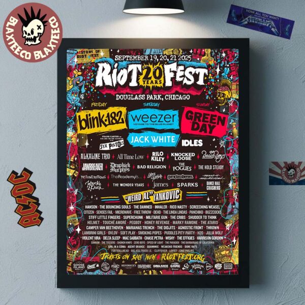 Celebrate two decades of punk, rock, and raw energy with this exclusive Riot Fest 20 Years Poster Canvas, showcasing the full 2025 festival lineup at Douglass Park in Chicago, Illinois. Held on September 19, 20, and 21, 2025, this commemorative home decor poster is a must-have for fans who live and breathe the Riot Fest experience. Whether you were part of the crowd or simply admire the legacy, this artwork captures the spirit of one of America’s most iconic music festivals.