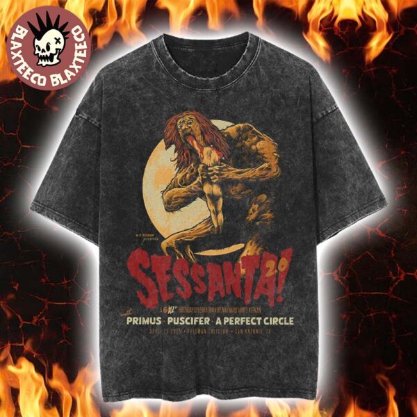 Celebrate one of the most epic live music events of the decade with the Sessanta V2.0 San Antonio Texas Concert Merch Tee, designed for Maynard James Keenan’s unforgettable 60th birthday celebration at Freeman Coliseum on April 29, 2025. This vintage-style washed t-shirt features bold, eye-catching artwork inspired by classic horror aesthetics — with a feral creature gripping a limp figure under a haunting moon, perfectly capturing the raw intensity of the Primus, Puscifer, and A Perfect Circle lineup. The distressed wash gives the shirt a worn-in, timeless rock ‘n’ roll edge, making it an instant staple for true fans.
