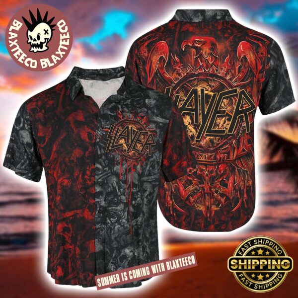 Blaxteeco: About Slayer Multicolour Skull Pattern Blood Eagles Red And Grey 2025 Summer Hawaiian Shirt Introduction: